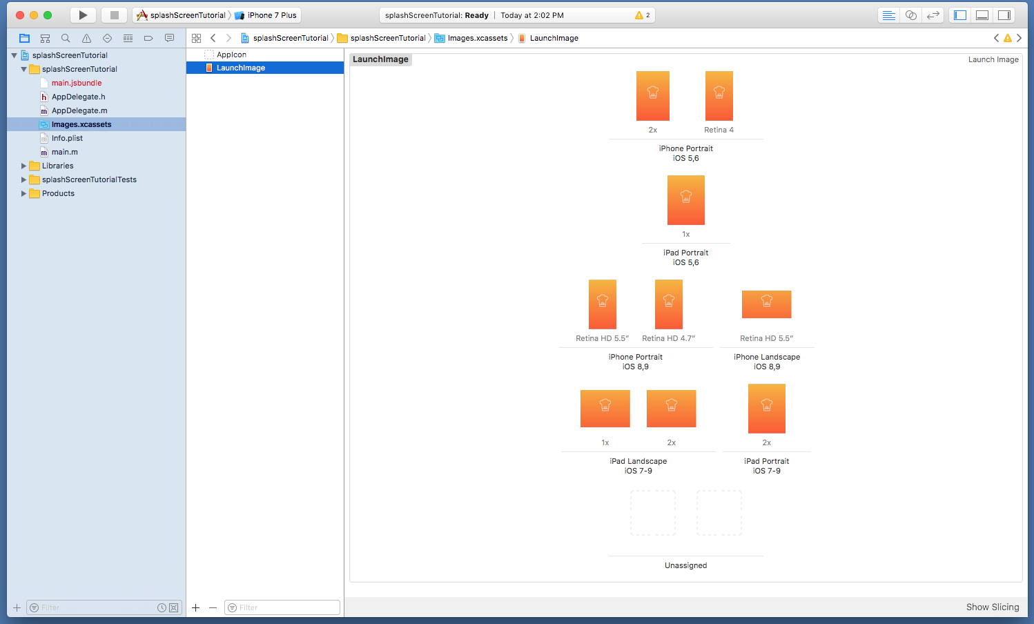 React Native는 기본적으로 LaunchScreen.xib를 생성하므로 Images.xcassets 내에 LaunchImage를 생성했습니다.